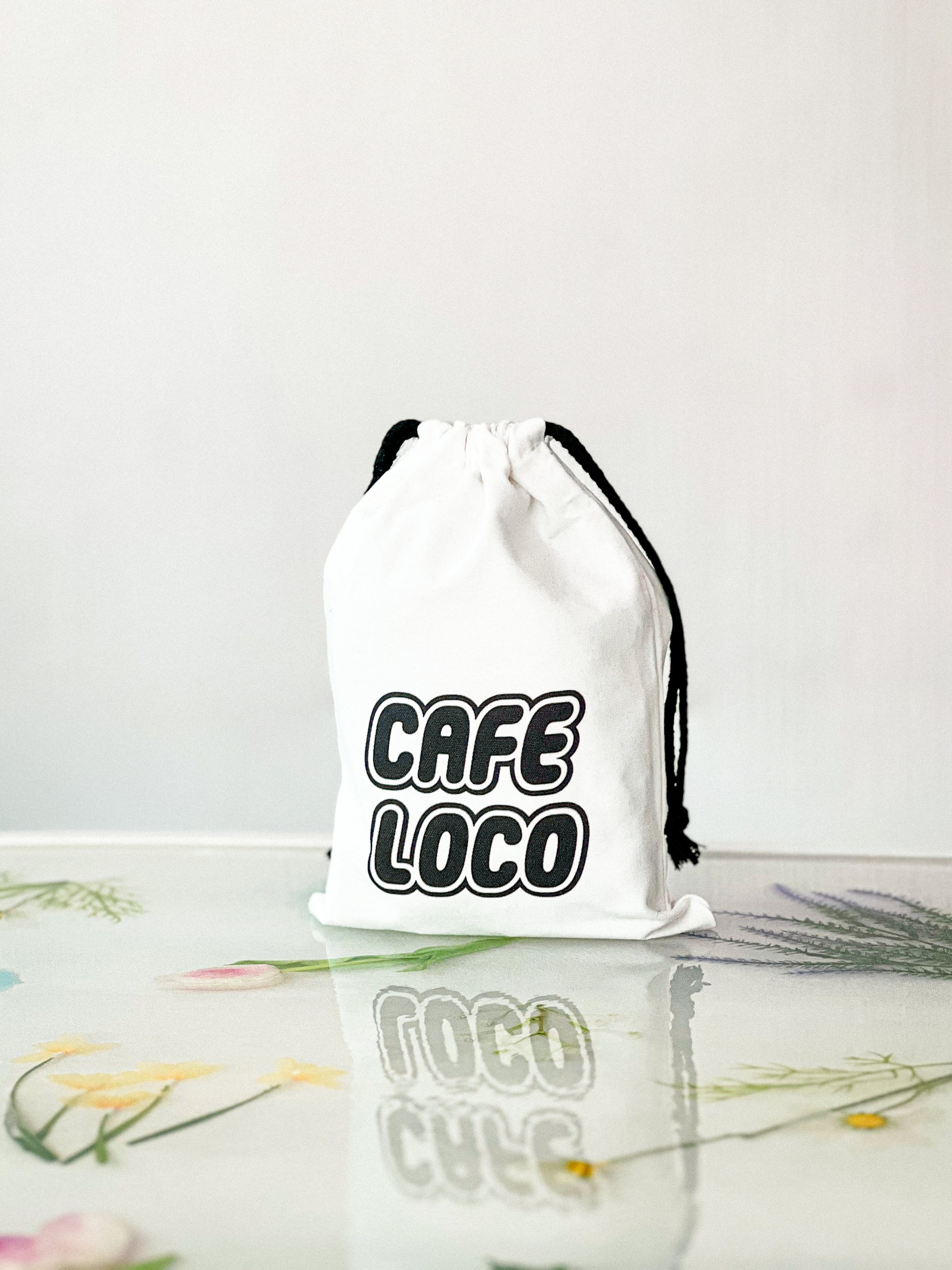 Cute pouch with adjustable drawstring and CAFE LOCO logo printed.