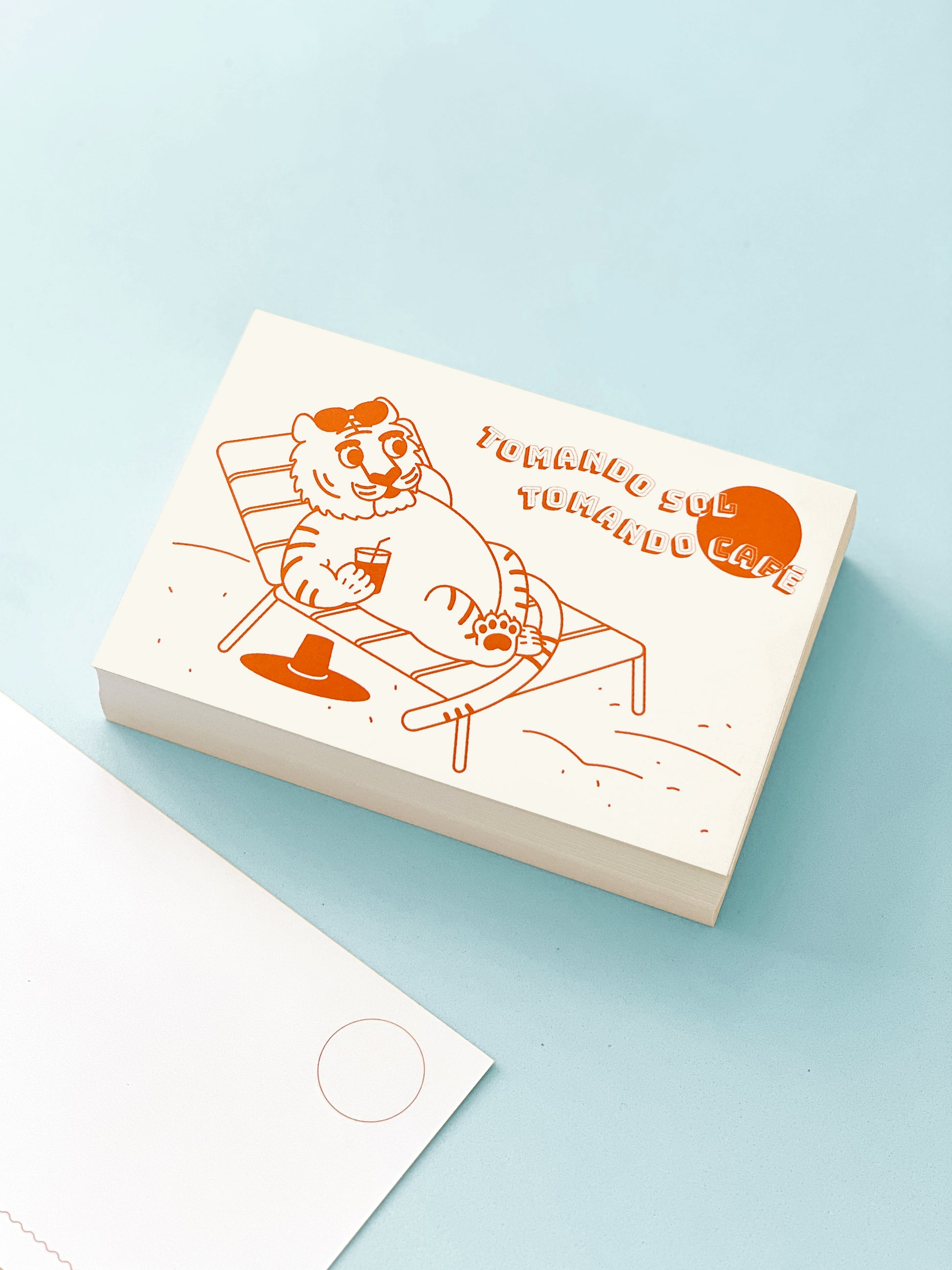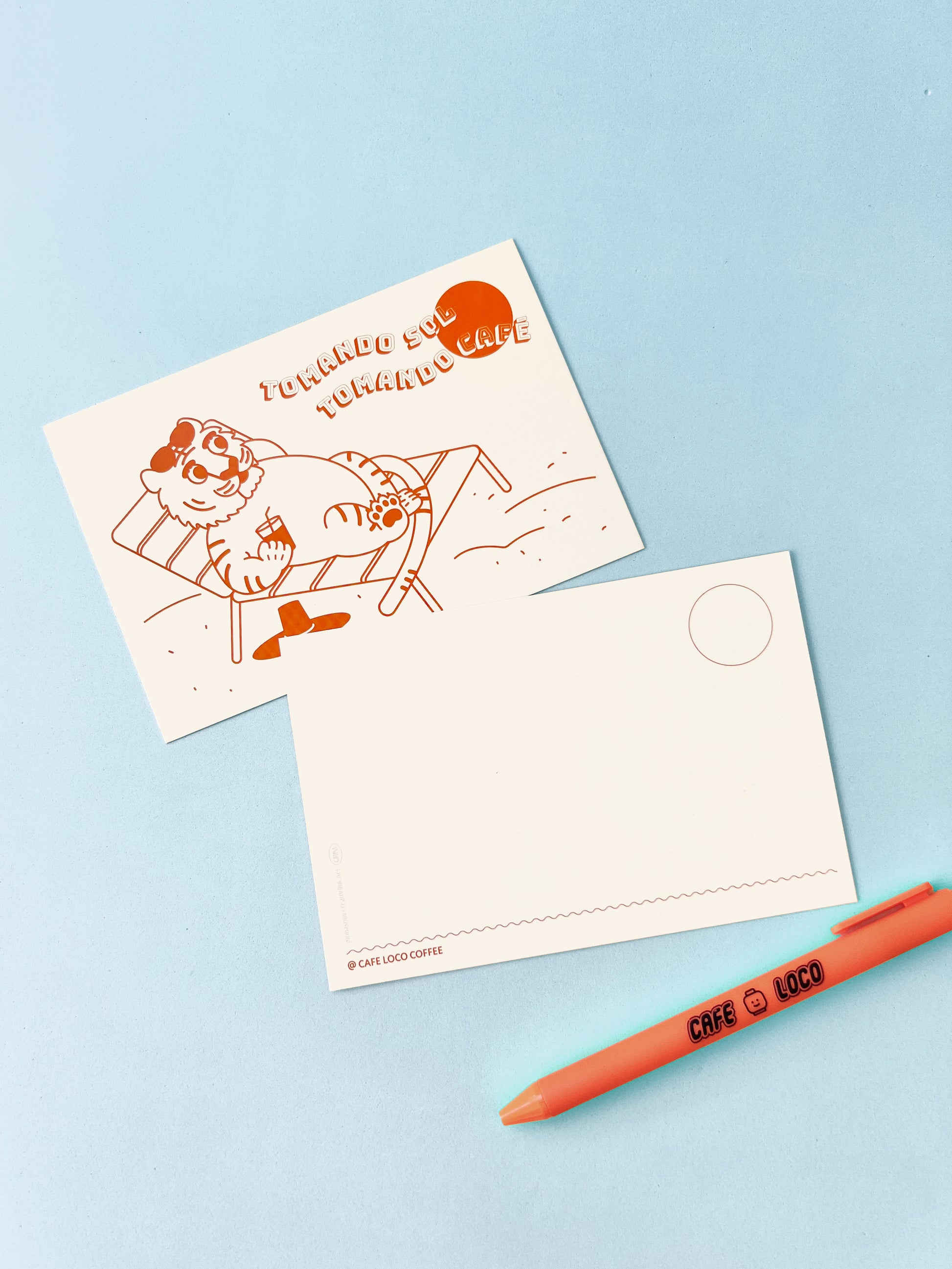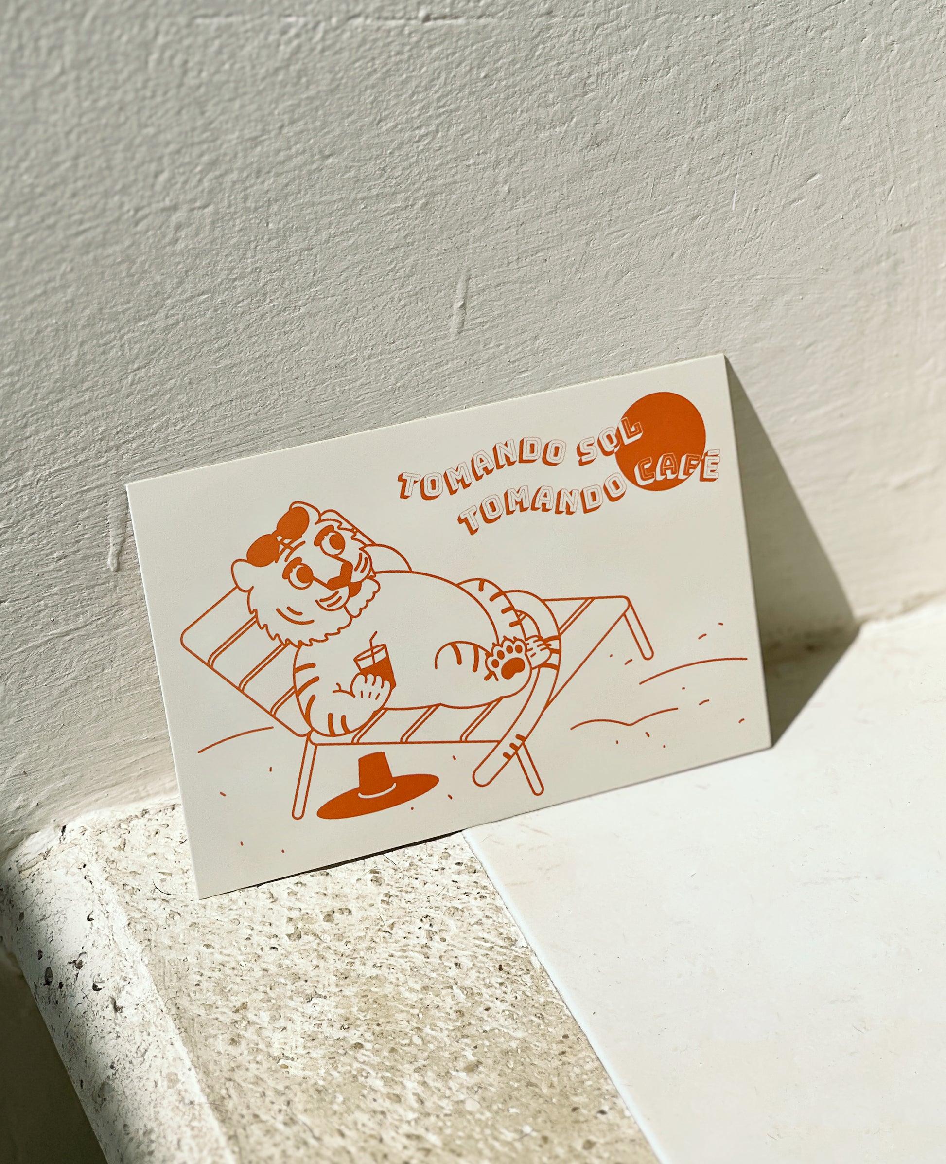 Illustrated postcard of Horang enjoying the blazing sun of the Yucatan Peninsula with a cup of coffee.