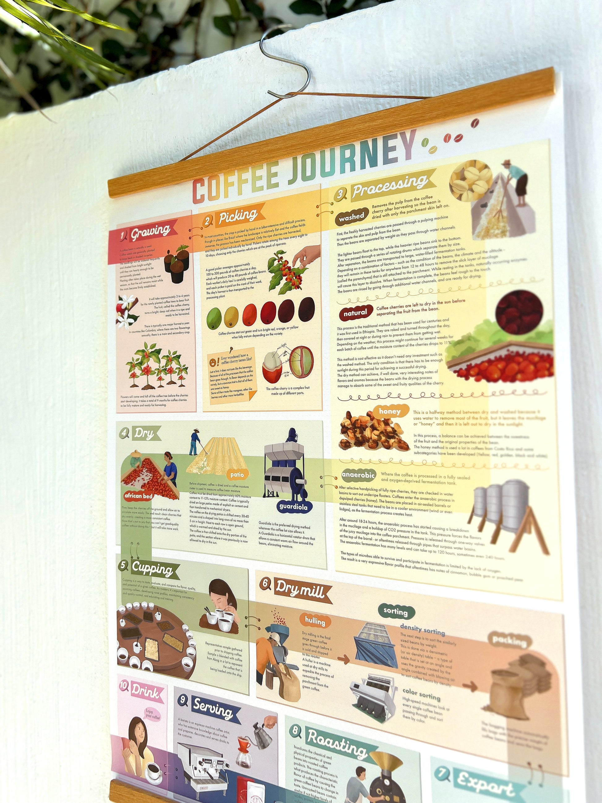 From the farm to the cup of coffee. An illustrated poster showing the entire coffee production process.