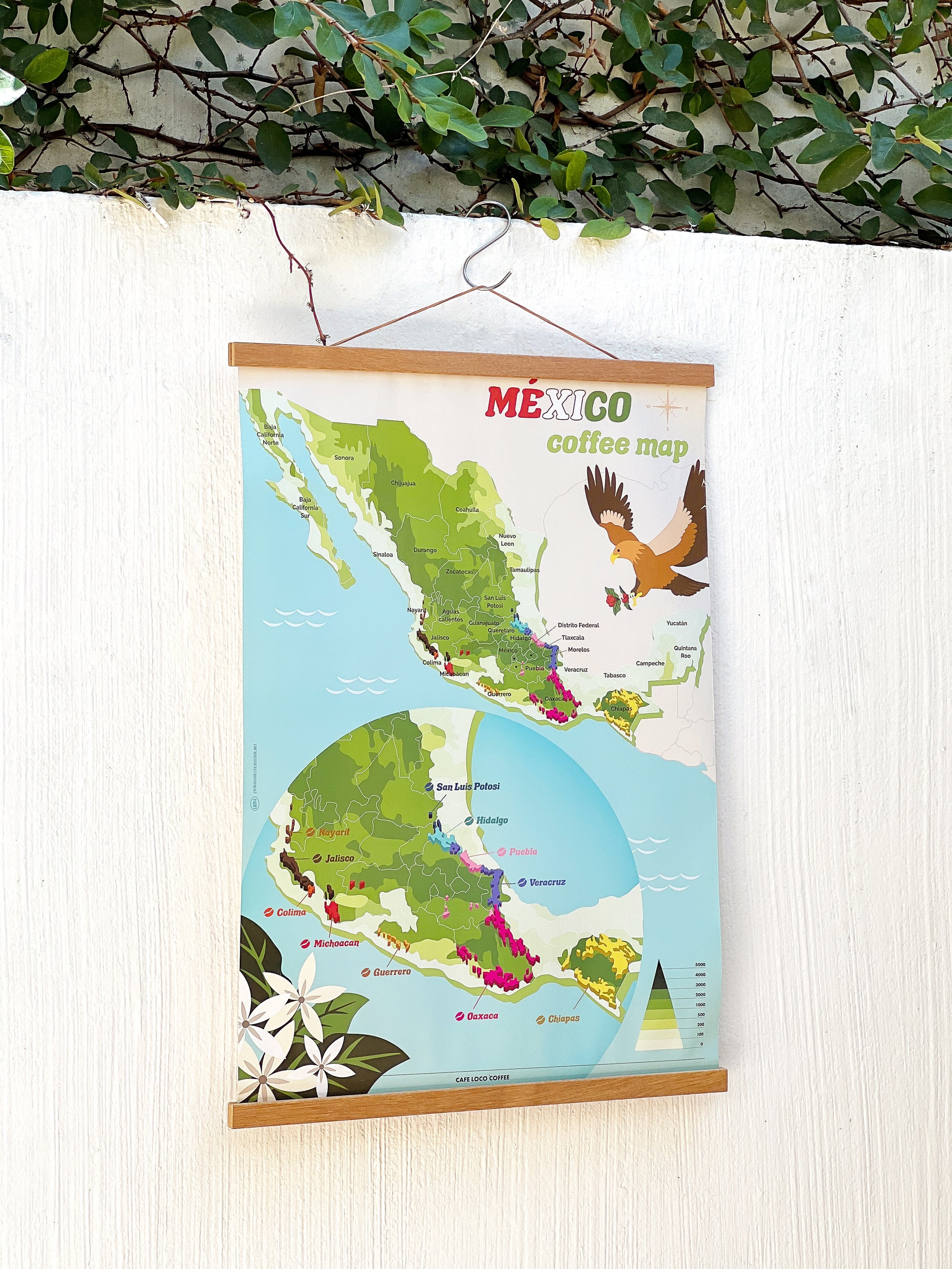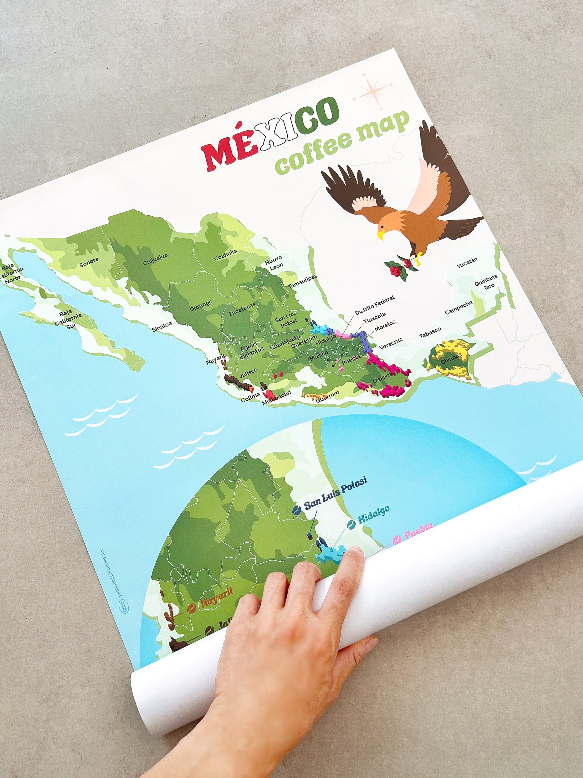 Póster ilustrado para descubrir de un vistazo las zonas de producción de café en México.