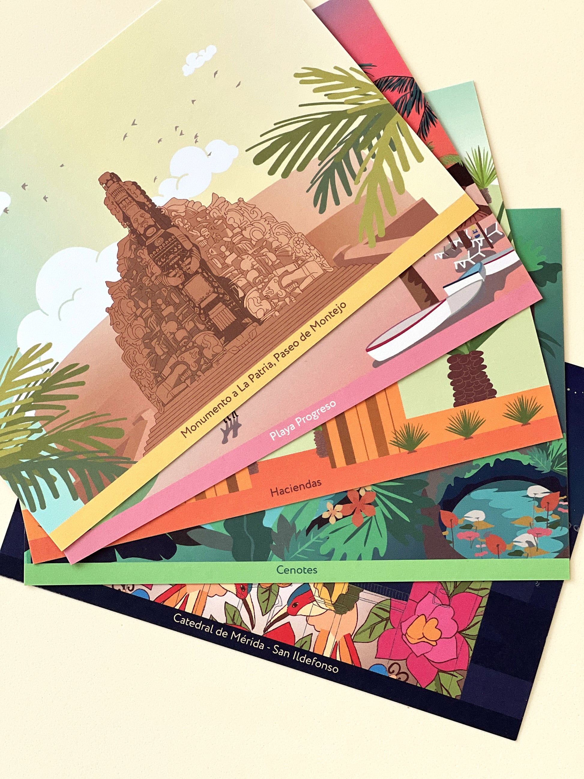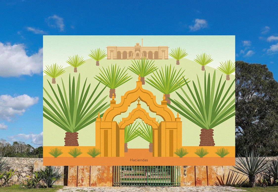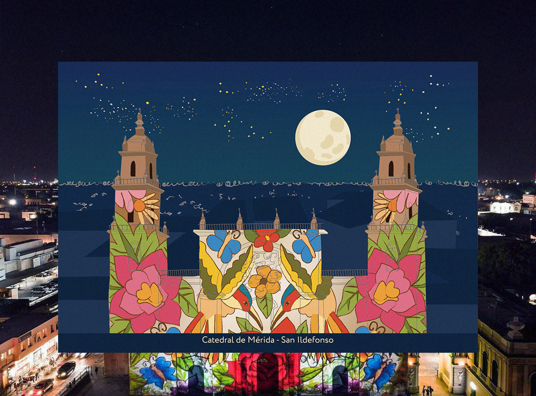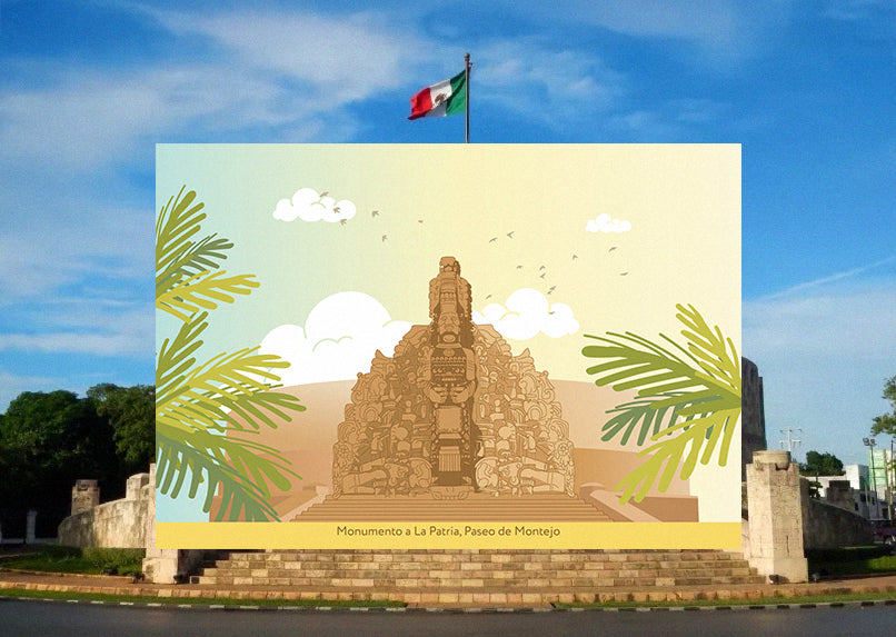 Es una postal ilustrada con los lugares más emblemáticos de Mérida, una ciudad representativa de la península de Yucatán.