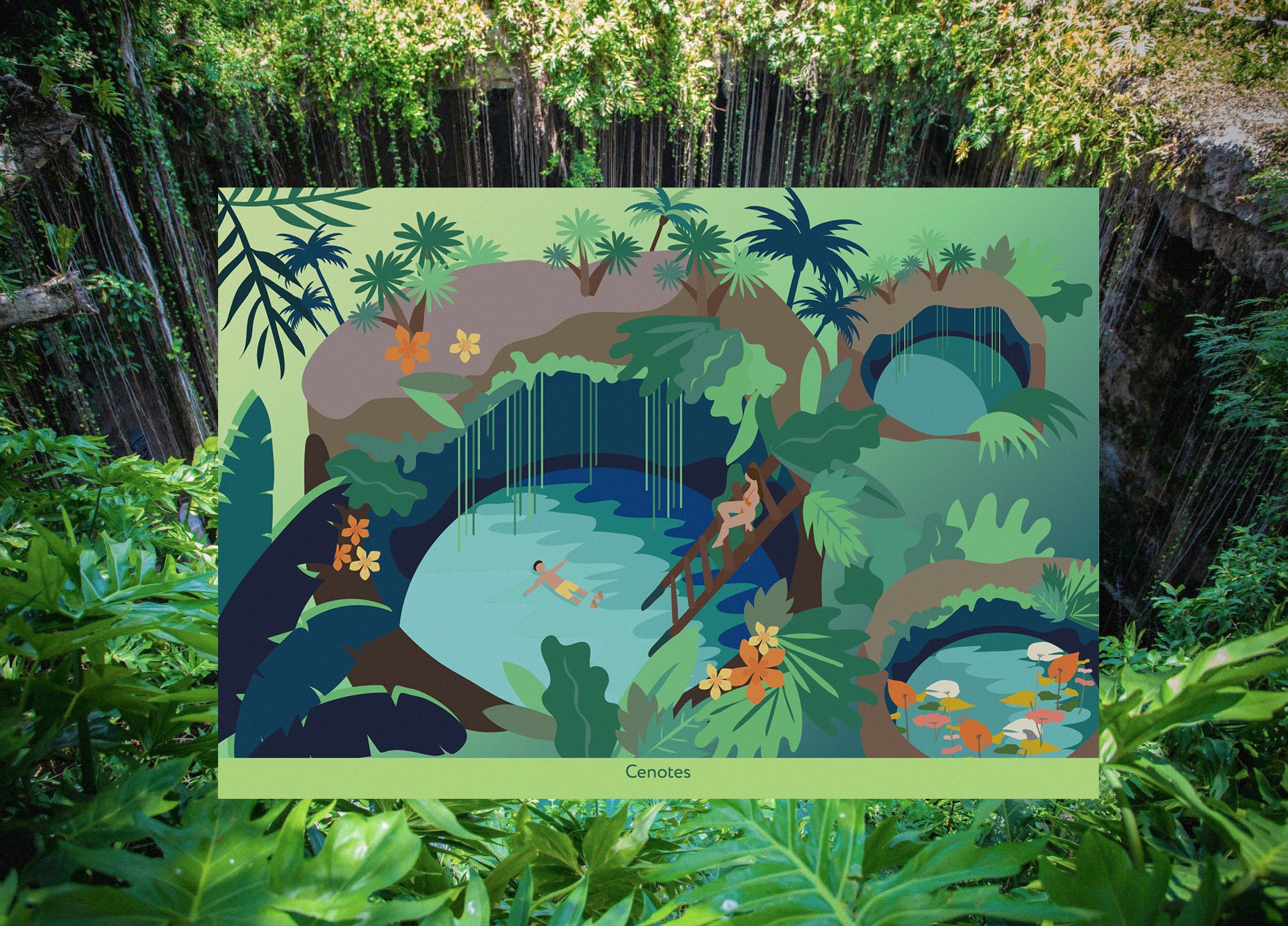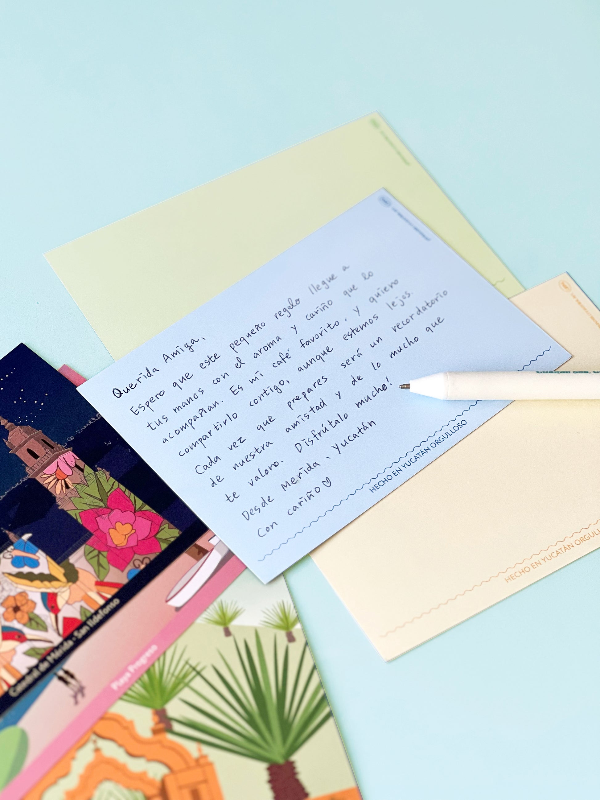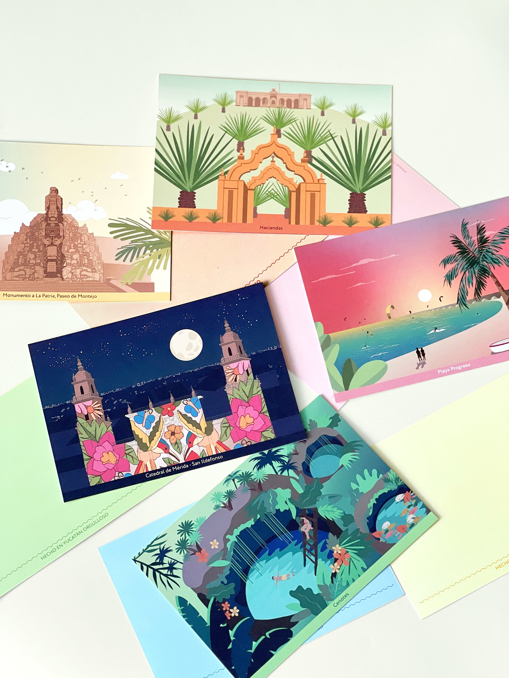 Es una postal ilustrada con los lugares más emblemáticos de Mérida, una ciudad representativa de la península de Yucatán.